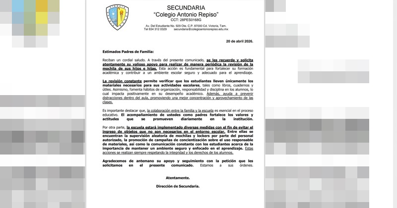 Mediante comunicados enviados a los padres, la dirección de secundaria pidió también el apoyo de las familias para revisar las pertenencias de sus hijos desde casa y dialogar con ellos sobre la importancia de mantener un ambiente seguro, mientras las actividades escolares continuarán en horario normal.
